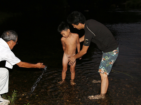 午前5時に東有年自治会館を車で出発。途中の峠にある小社に参拝してから竹万へ。恵一君は伝統にならって全裸で川に入り、父の典之さん(42)が水をかけた。