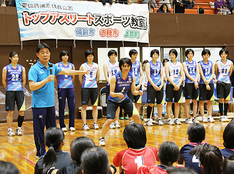 東備西播定住自立圏形成推進協議会が主催した「トップアスリート招聘事業」。リオ五輪・バレーボール日本女子代表の山口舞さん(33)、宮下遙さん(22)を含む19選手が来穂した。