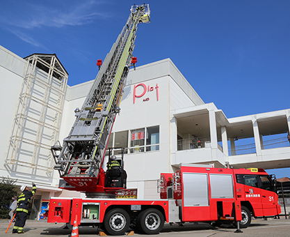 救助隊が逃げ遅れた人たちを避難誘導。屋上で救助を待つ人たちを35メートル級はしご車で地上に降ろし、エアーテントを設営した救護所で負傷の程度を確認するトリアージ判定を行った。