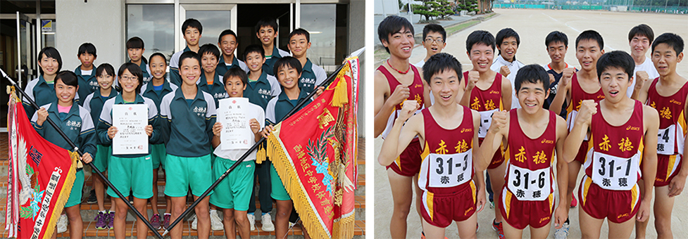写真左は西播中学駅伝で男女同時Vの赤穂西中メンバー。同右は36年ぶりの県大会出場を決めた赤穂高男子チーム