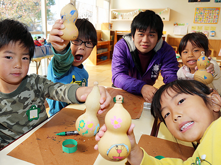 同園では今年6月にも高校生が訪れ、園児と一緒にひょうたんの苗10株をプランターに植え付けた。10〜15センチ程度の実がなり、10月5日に生徒と園児で収穫。この日は乾燥させて種を取り除いた実に園児が一人一個ずつマジックで絵を描き、中に小豆やペレットを入れてマラカスを完成させた。