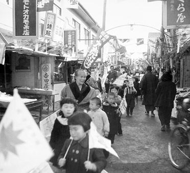 国鉄赤穂線開通の祝賀行列が歩く花岳寺通商店街=昭和26年