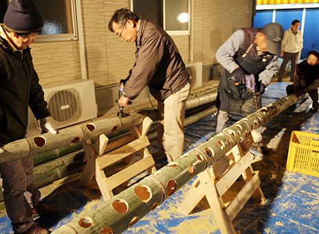 市民有志の実行委員会が企画した。所有者の了解を得て竹林から切り出した孟宗竹を寸法に合わせてカット。商店街や地元周辺の自治会、市職員など、さまざまな立場の約50人が自分の都合のつくときに花岳寺通商店街の広場に集まり、ドリルで竹に穴を開ける作業を行っている。