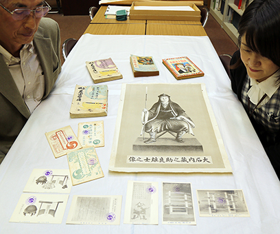 講談の速記を活字化して明治30年に出版された『赤穂義士銘々伝』、東京・泉岳寺の参詣記念として作られた絵葉書セット(明治〜昭和初期)、大石内蔵助の石版画(同)など。5年ほど前に町内で廃棄されそうになっていたものを田原さんと吉川さんが回収して保管。「歴史資料として役立てほしい」と同館へ寄贈した。