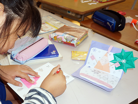5日の1時限目に5年生と6年生が集まって一生懸命プレゼントを作りました。雪の降らない台湾の子どもたちにパンチで型を抜いた雪だるまやもみの木、雪の結晶などを貼った折り紙に「Merry Christmas!」と書いて自分の名前も書きました。