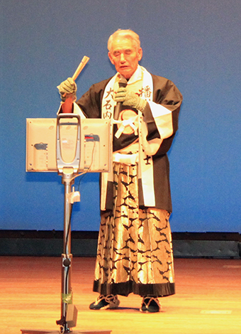 カラオケ大会は中広の赤穂市文化会館ハーモニーホールで開かれ、川尻さんは主催の市民グループが準備した義士衣装を着てステージへ。約300人の観客を前に十八番の「俵星玄蕃」を熱唱した。