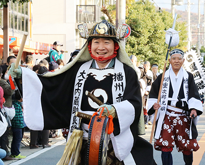 パレードには市民や地元企業・団体など総勢約1000人が出演。色艶やかなお姫様衣装を身にまとった「義士娘人力道中」、忠臣蔵の登場人物に扮して歩く義士伝行列など18演目が赤穂城大手門前から「いきつぎ広場」まで約1・1キロを進んだ。