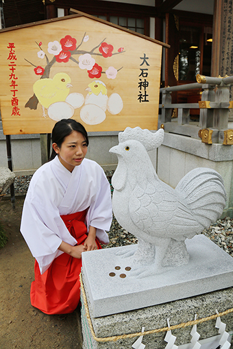 同神社では平成19年から干支の石像と大絵馬を拝殿前に設置。飯尾宮司は「来年は鳥のように羽ばたき、飛躍する一年になれば」と願っていた。