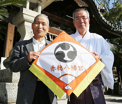 赤穂八幡宮に手作り和凧を奉納した石橋明弘さん(左)