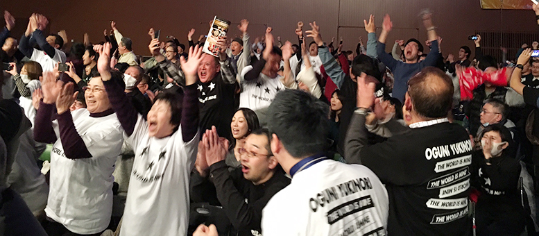 世界王者となりチャンピオンベルトを巻いて応援団の声援に応える小國以載選手