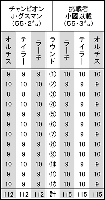 この日もグスマン選手の反撃を浴びた第7ラウンド後のインターバルに「なんでもらったかわかるか。全部動きが一緒になってるからや」と助言。小國選手は小刻みなフェイントと前後左右のステップへの意識を取り戻した。第9ラウンド終了時には、「このままやったら危ない。あと全部取るつもりで行け」とはっぱ。もし、ラスト3ラウンドのポイントをグスマン選手に奪われていれば、判定は逆の結果になっていただけに、的確な指示が小國選手をチャンピオンへ導いた。