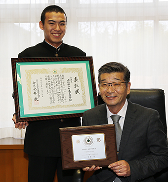 今年度の学校防犯対策委員長を務める松尾祐哉君(15)=3年=は「取り組みを始めて続けて来た先輩方のおかげ」と感謝し、「活動することで自分たちの交通安全への意識も高まった」と効果を話した。色波校長は「生徒の自主的な取り組みが評価されたことがありがたい。学校の伝統として今後も引き継いでいきたい」と表彰を喜んだ。