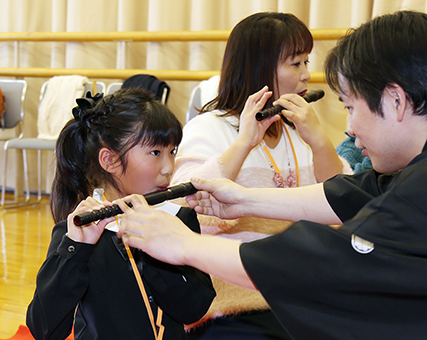 ワークショップでは笛、小鼓、大鼓、太鼓の4種類を順番に体験。講師から基本的な演奏方法を教わり、「船弁慶」で演奏される曲の音出しに挑戦した。親子で参加した木津の小学3年、望月可憐さん(9)は「笛はなかなか音が出なかったけど、練習したらちょっと出た」とうれしそうだった。