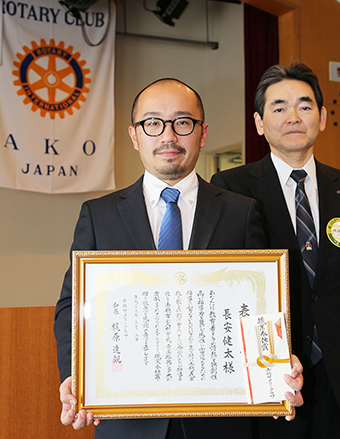赤穂ロータリークラブから職業奉仕賞を贈呈された長安健太氏