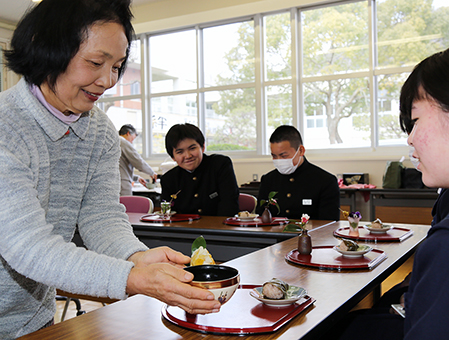 活動が始まったのは平成17年。同校で生け花ボランティア活動をしていた西有年の橋本晴美さん(72)と山本隆子さん(73)が当時の圓尾和也校長から「生徒に華道や茶道を教えてもらえないでしょうか」と相談を受けた。「教えることはできませんが、お茶の接待なら」(橋本さん)と引き受け、「お茶を通して、相手を思いやる気持ちを育んでほしい」との思いを込めて「心の教室」と名付けた。