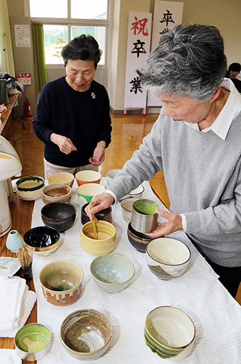 休み時間が近づくと、茶碗にお湯を注いで器を温める。抹茶は無農薬栽培された茶葉をひいたものしか使わない。一輪挿しの花は自宅の庭でその日の朝に枝を摘む。ようかん、醤油饅頭など週替わりの茶菓子は手作りすることも。橋本さんたちは「十分な点前はできませんが」と言うが、おもてなしの心がこもった一服だ。橋本さんは「入ってきたときよりも表情が明るくなって教室に戻っていくのを見ると、うれしくなります」と話す。