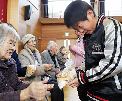 「みなさんが作ってくれたお米で、私たちが気持ちを込めて作ったかきもちです。お召し上がりください」と坂越美代子さん(89)。児童を代表して謝辞を述べた6年の安原希(のぞみ)さん(12)は「来年も在校生がお米を持っていきますから、よろしくお願いします」とあいさつした。