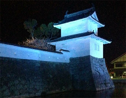 昨年の「ライト・イット・アップ・ブルー」で青く照らされた赤穂城隅櫓=実行委員会提供