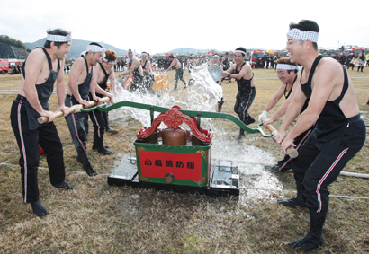 式典中、市内で民家火災が発生し、第1・2分団が緊急出動する場面も。見物に来ていた中広の主婦は「頼もしさを感じました。けがのないように気をつけて活動して」と気遣っていた。