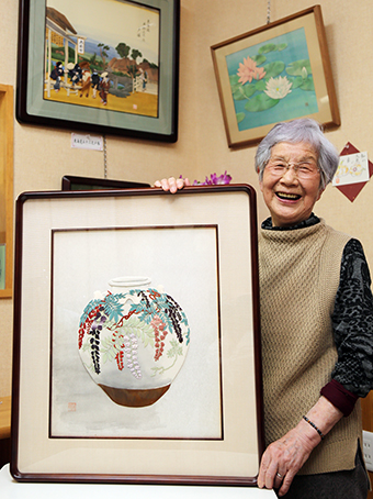 「米寿の記念に」と妹の小島愛子さん(69)=塩屋=から勧められ、初めての個展。木村さんは「押絵は細かい作業で大変ですけど、この年になっても健康で作品を作ることができ、ありがたいことです」と笑顔で話す。