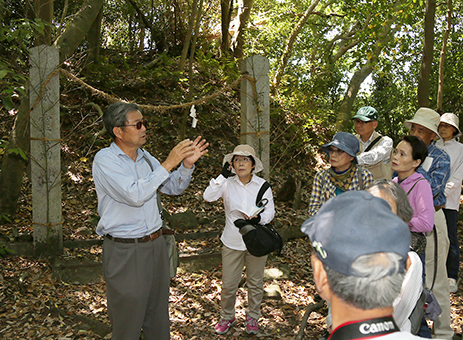 この日は漁船2隻のピストン輸送で島へ渡航。かつて船乗りが飲用した井戸が残る山道を80メートルほど登り、円墳がある西端山頂に到達した。墳墓はしめ縄を渡した石柱の奥に小山のようにあり、参加者らは滅多に見ることのできない史跡を前に歴史ロマンに浸った。