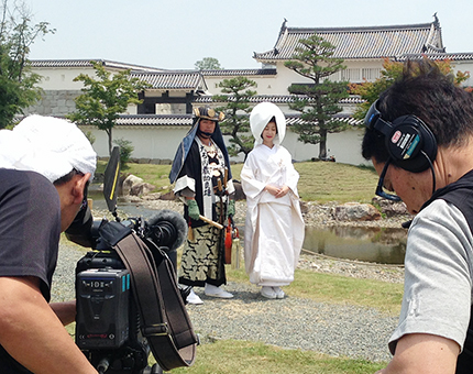 忠臣蔵ウエディングは「忠臣蔵ウイーク」の企画イベントとして平成24年以降4組が挙式。内蔵助の衣装一式を赤穂市が無償で貸し出している。この日は住谷明日香アナウンサー(26)が自ら新婦役となり、新郎役と神社に参拝した後、二之丸庭園を散策したり、人力車に乗って城下町を巡る様子などを収録した。