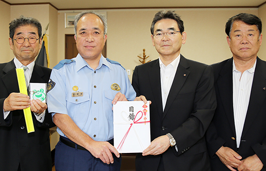 交通安全グッズを寄贈した赤穂ロータリークラブの梶原達観会長=右から2人目