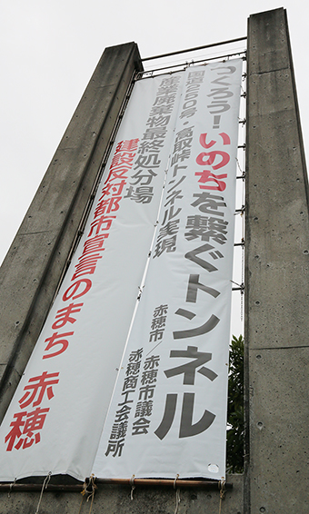 市は「交通事故減少、災害時の交通路確保などトンネル整備のメリットを表現した」とスローガンの意図を説明。当面は「産業廃棄物最終処分場建設反対都市宣言のまち 赤穂」と「忠臣蔵を大河ドラマへ」の懸垂幕と順繰りに2本ずつ掲出していく。