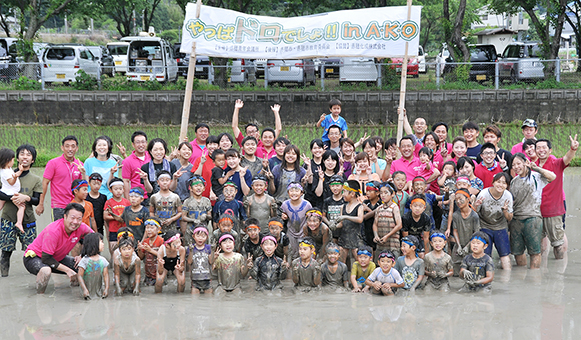 自然の魅力を感じながら大人と子どもが共に楽しむ場を提供しようと、赤穂青年会議所(森谷充孝理事長)が主催。20アールの水田を会場に親子35組が参加した。