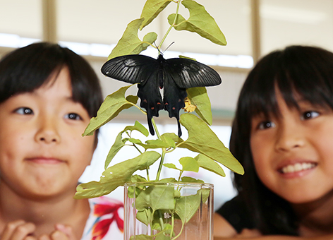 「幼虫は『気持ち悪い』と思ったけど、きれいなチョウチョになった」と中村璃優斗(りゅうと)君(8)。釜増めぐみさん(8)は「教科書の写真で見るよりも飛んでいるチョウはきれい」。担任の坂本哲也教諭(27)は「“生きた教材”で子どもたちが理科に興味を持つきっかけになっています」と成果を話した。