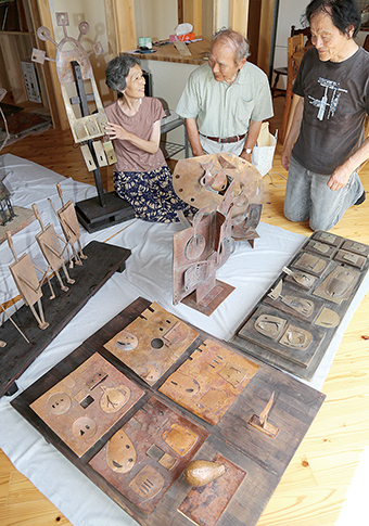「ロダンにあこがれて彫刻を始めた」という粟田さん。石膏を手始めにセメント、焼物、木彫、金属とさまざまな素材を扱い、終生のテーマとした「古代文明からのいざない」を追い求めた。妻の和子さん(71)の話では、創作に没頭して4〜5日続けて徹夜することもあったという。