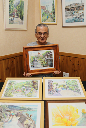 日課の散歩で見かけた家並みや自宅の庭に咲くアジサイ、サボテンなどを4号または6号の画用紙に描いた。「見慣れた景色や花も少し視点を変えると新しい発見がある」と徳丸さん。風景画は人物を入れることで動きをアレンジし、光と影を意識した花の絵は爽やかな美しさを感じさせる。