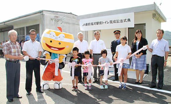 新たに完成したトイレは鉄筋コンクリート造平屋建て。ベビーシートのある多目的トイレと男子トイレの2基がある。明石元秀市長も出席した式典には地域住民など約200人が集まり、尾崎の江端恭臣さんが自作の「備前福河駅トイレの唄」を披露。「備前福河 トイレがいつもきれいやでぇ♪」などと歌った。