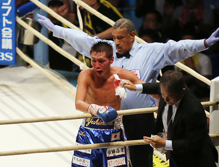 相手のパンチによる負傷出血でレフェリーが試合をストップ