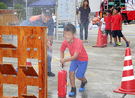 親子で災害へ備える意識を高めてもらおうと、市内母親クラブの赤穂市地域活動連絡協議会が主催した。はしご車や救急車など車両16台を展示。豪雨や浸水を再現したシャワー付き仮設プール、スモークを充満させた訓練用施設もあり、水害や火災からの避難を疑似体験した。