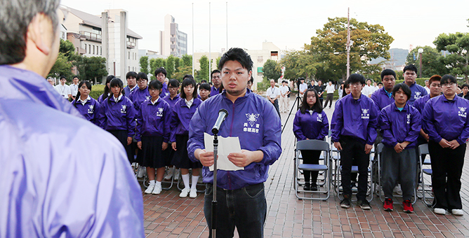 結団式で決意表明する生徒会長の機谷惟誓君