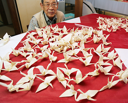 圧巻は100羽近くが網のように連なる「百鶴」。三木さんは「平面から立体が出来上がる折り紙のおもしろさを感じてもらえれば」と話している。