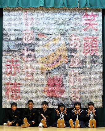 制作したのは赤穂西中学校(尼子勝義校長)の1年生生徒117人。学級委員がカメラマンとなって撮影したクラスメートのスナップ写真約250カットを縦2・5センチ、横3センチのサイズで大量にプリント。専用ソフトで割り当てられた配置に従って生徒全員で手分けして貼り付け、赤穂城をバックにポーズをとる陣たくんと「笑顔あふれる しあわせ赤穂」の文字を描いた。