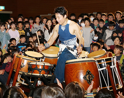太鼓楽曲創作コンクールで入賞歴のある和太鼓演奏家、溝端健太さん(29)が長胴太鼓や締太鼓、どらなどで「侍」や「祭」をテーマにしたオリジナル曲を披露。同校の校歌から着想した即興曲も奏でた。最後は児童や保護者が取り囲む中、8つの太鼓を駆使して「喜怒哀楽」をイメージした曲を熱演。力強いバチさばきに会場も手拍子を打ち、大いに盛り上がった。