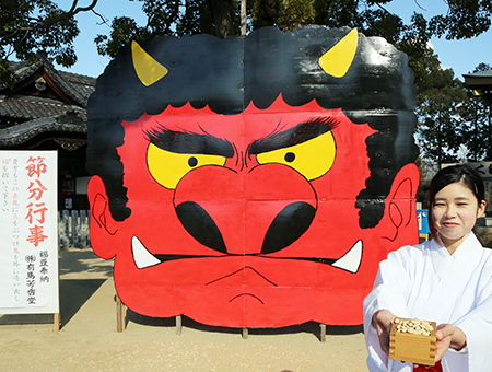 同神社では「鬼を外に追い出し、福を招いて」と毎年節分に合わせて鬼の巨大看板(縦約3・2メートル、横約3・6メートル)を境内に設置し、参拝者に無料で福豆を提供している。