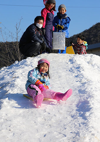完成したミニゲレンデは幅約2メートル、長さ約9メートル。園児たちは段ボールにひもを付けた手作りのそりで勢いよく滑り降りた。年少組の森辻葵ちゃん(5)は「空を飛んでるみたい」と大喜び。ポパイクラブの前田稔会長(37)=周世=は「子どもたちの笑顔を見るために頑張りました」と園児らの歓声にうれしそうだった。