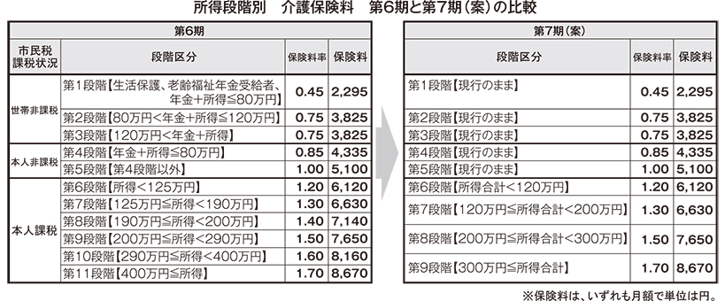 ただし、現行第6段階(本人市民税非課税で合計所得125万円未満)のうち合計所得が120万円を超える人は、改定後は第7段階に組み入れられ、保険料は現行の6120円から6630円にアップする。また、現行第10段階(本人市民税非課税で合計所得290万円以上400万円未満)は、合計所得が300万円未満なら保険料は8160円から7650円へ下がる一方、300万円以上だと8670円に上がる。