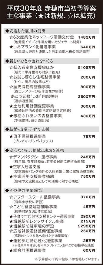 市税収入と地方交付税の減収で一般財源の伸びが見込めない中、市債発行と基金取り崩しで財源を確保。赤穂市総合戦略の基本目標に関わる施策に重点的に予算配分した。市長就任後、4度目の予算編成となった明石元秀市長は「将来を見越して多少背伸びした。財源が厳しくとも、住民福祉の向上は図っていかなければならない」と語った。