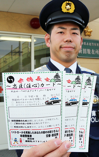 赤穂署の「忠臣(注心)カード」は平成28年10月に署員の発案で作製した。「市民の安全に心を注ぐ」という意味の「注心」と「忠臣蔵」を掛けたネーミングが評価され、県警のパトロールカードコンクールで最優秀賞に選ばれた。