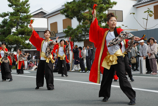 開幕を飾るパレードは加里屋のお城通りで午前10時半から始まった。次々とチームが登場し、色鮮やかな衣装をまとった踊り子らが躍動感あふれる演舞を披露。沿道の見物客も拍手や手拍子で迫力ある踊りを盛り上げた。