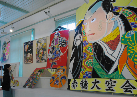 凧愛好家グループ「赤穂大空会」(西濱正行会長)が収集した約40点。北は青森の「津軽凧」から南は福岡の「玄海龍」まで各地の珍しい凧を展示している。同会が製作した畳3枚分のジャンボな大石内蔵助凧もあり、カラフルな絵柄やユニークな形が来館者の目を楽しませている。