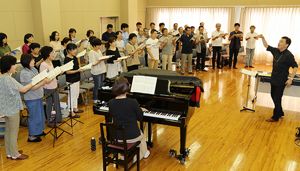 合唱指導で今年になって4度赤穂を訪れた山口氏は「どんどん良くなっている。当日は静かに始まり、真っ赤に燃えて終わるステージになる」と熱演を約束。森角英規団長(57)=砂子=は「観客に感動してもらえたら最高」と抱負を語った。