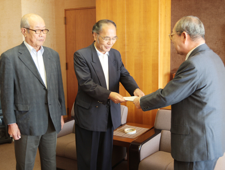 「改定は妥当」との答申書を豆田正明市長に手渡す林頼夫会長(中)