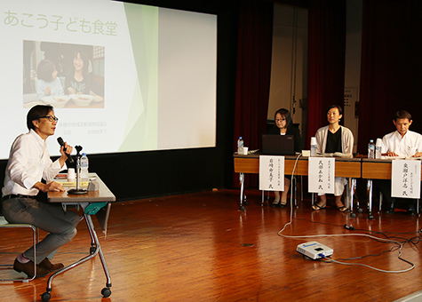 講演後のシンポジウムでは、赤穂市内で子ども食堂を運営する岩崎由美子さんと氏部あかねさんも登壇。「学校に行きにくかった子が、子ども食堂をきっかけに学校へ行けるようになった」「子どもだけでなく大人も参加することで世代間交流にもつながっている」などと効果を発表した。また、市が施策に取り入れている明石市では、小学校の家庭科室や企業の社員食堂も活用して全小学校区に1カ所以上が開設されていることが報告された。