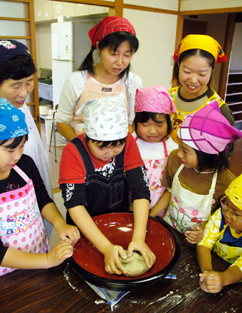 体験会は高雄公民館(原田一博館長)が主催し、近隣地区から7家族24人が参加。同市場のスタッフ5人の指導で生地作りから挑戦した。